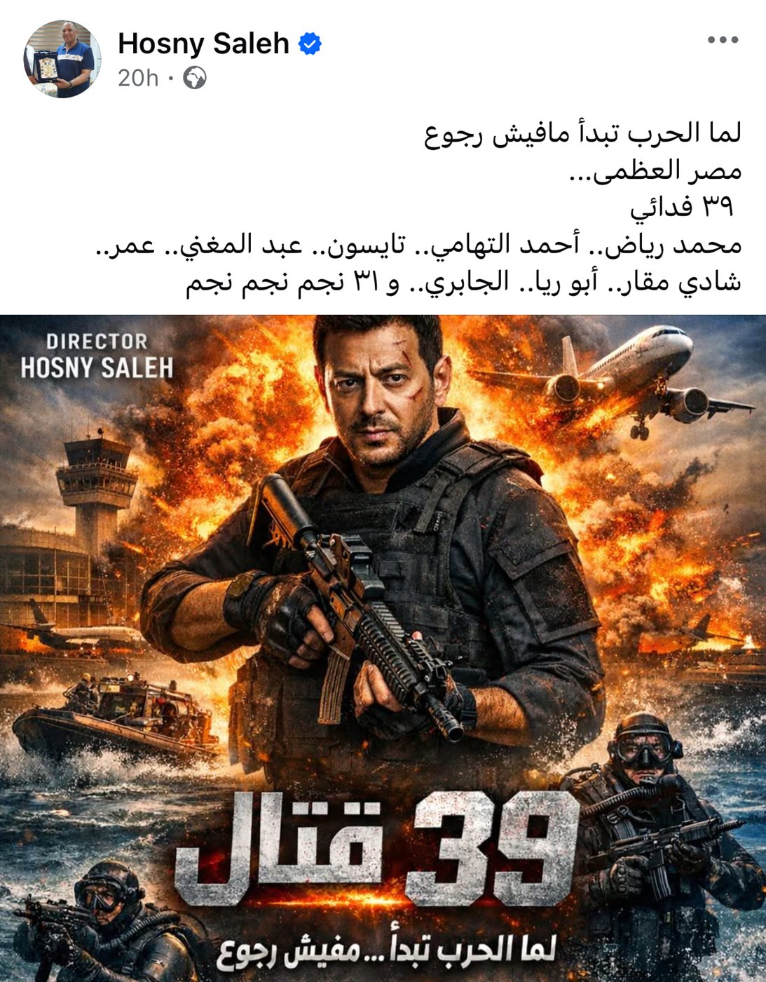 كما أرفق البوستر بتعليق لافت: “لما الحرب تبدأ مفيش رجوع.. مصر العظمى 39 فدائيا”، في إشارة واضحة إلى الطابع البطولي والوطني للفيلم.