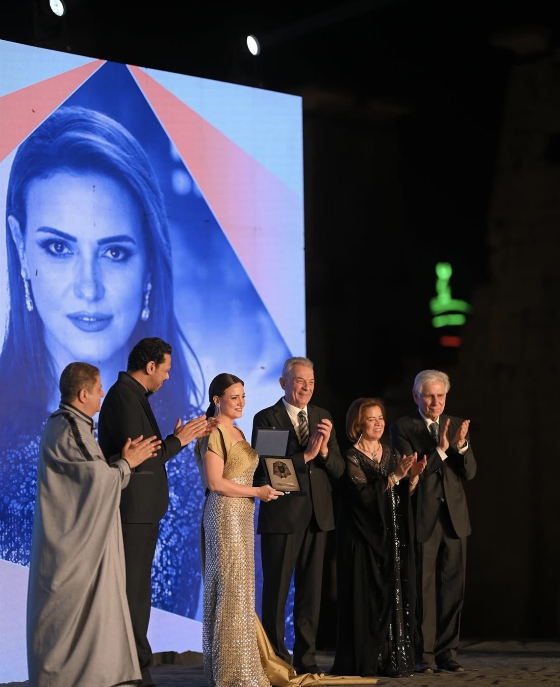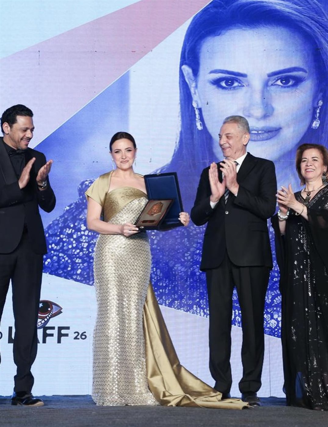 اختارت ريهام عبد الغفور فستاناً ذهبياً لامعاً بتطريزات دقيقة مرصعة بالكامل، ما أضفى عليه بريقاً لافتاً تحت أضواء السجادة الحمراء. تميز الجزء العلوي بقصة درابيه أنيقة عند منطقة الصدر، مع تصميم مكشوف الكتفين، فيما أضاف شال خفيف من نفس اللون لمسة ملكية ناعمة.