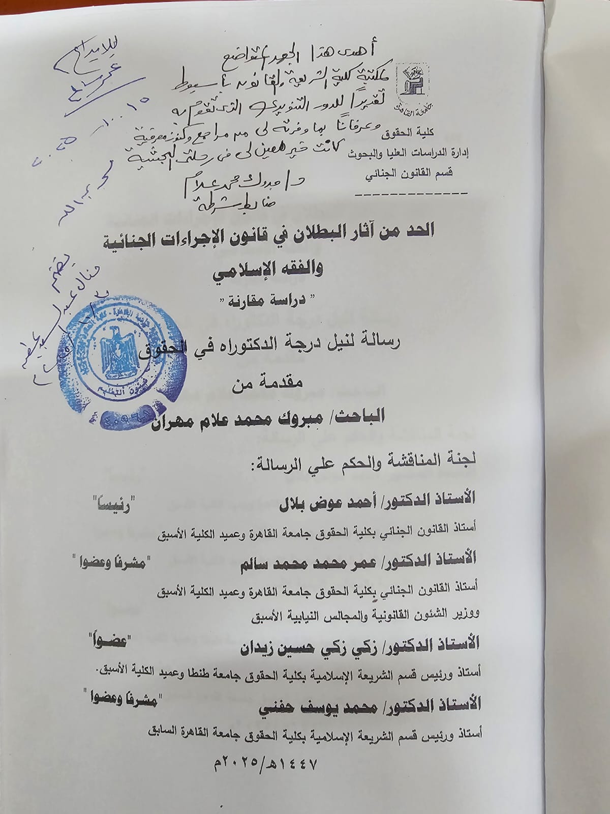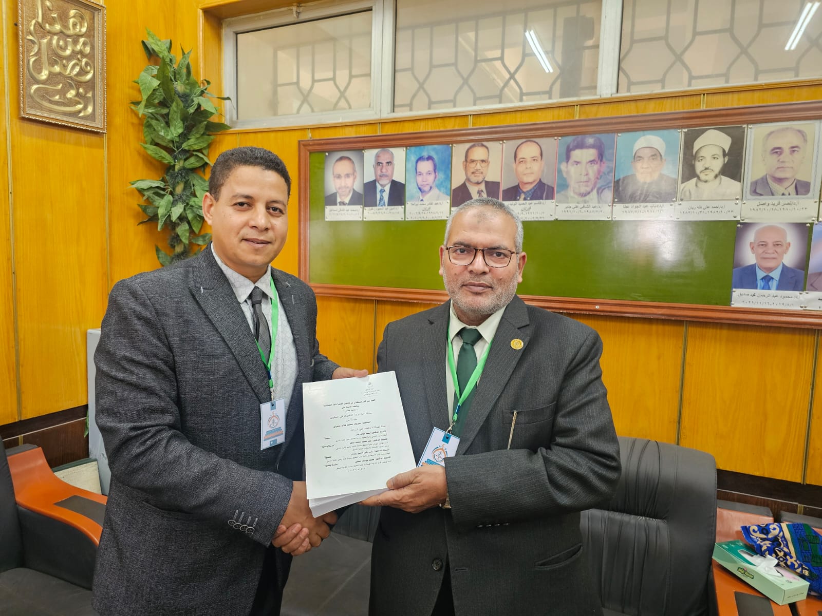 تسلم الإهداء فضيلة الأستاذ الدكتور عبدالفتاح بهيج العواري، عميد كلية الشريعة والقانون بأسيوط. وتأتي هذه الخطوة تمهيداً لإيداع الرسالة بمكتبة الكلية. ويهدف الباحث من ذلك إلى إتاحة عمله العلمي لجميع الدارسين.