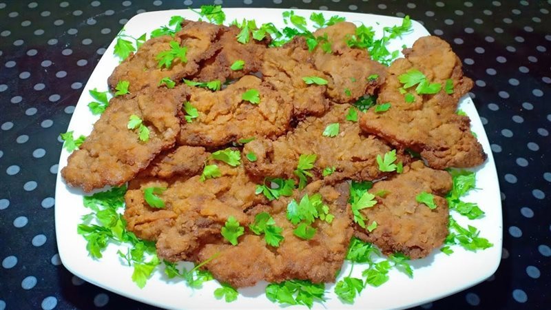 تقلى شرائح الكبدة في الزيت، وتقلب على الجانبين حتى تنضج.