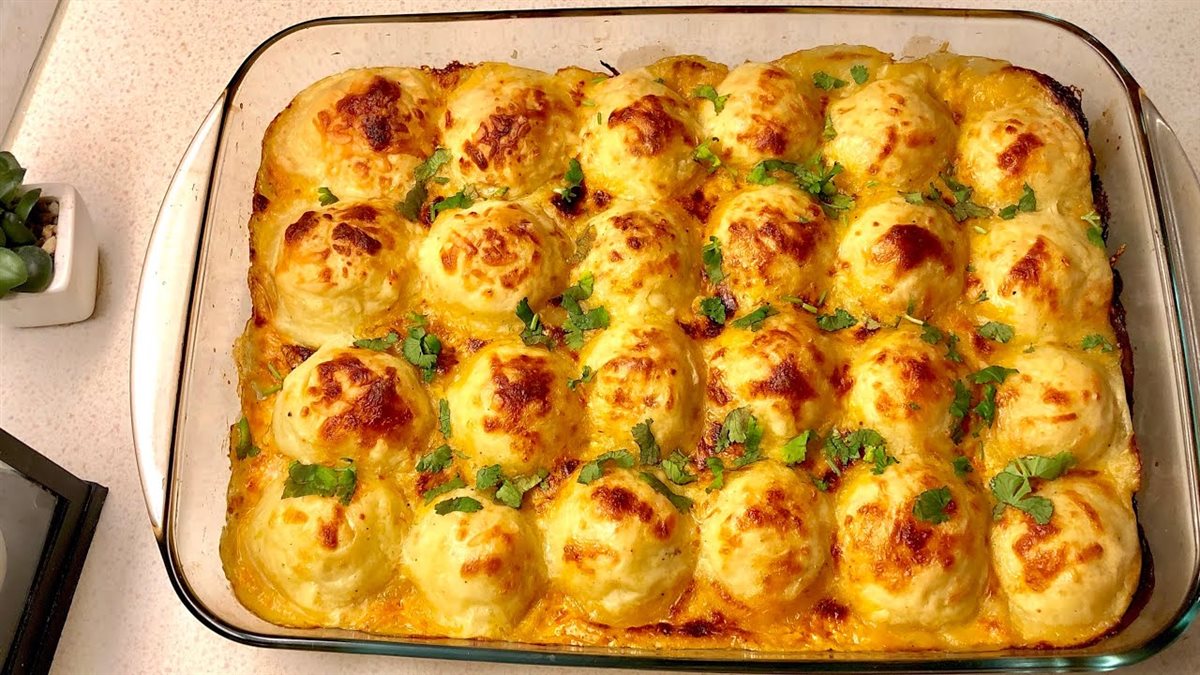 احشي حبات البطاطس المفرغة بحشوة اللحم وصفيها في صينية الفرن.