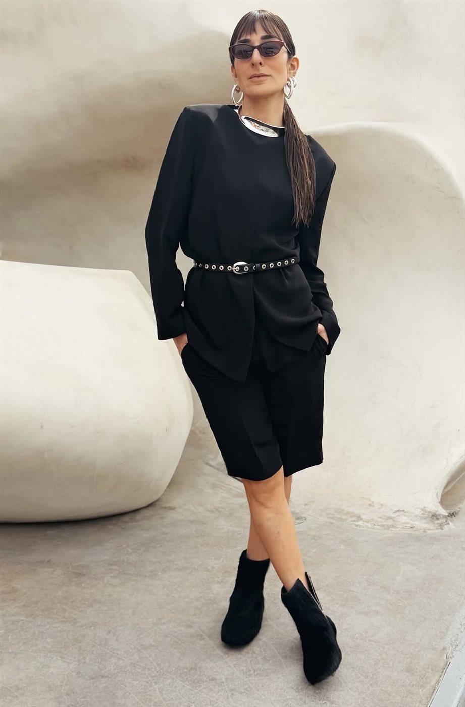 ومن ناحية التفاصيل، ظهرت أمينة خليل في الإطلالة الأولى مرتدية طقماً أسود بتصميم انسيابي، تميز بخطوط نظيفة وقصّة دقيقة، مع حزام عند الخصر أضاف لمسة عصرية أبرزت القوام بشكل أنيق. وقد أكملت إطلالتها بنظارة شمسية صغيرة بطابع كلاسيكي، إلى جانب مجوهرات فضية بتصميم عصري، بينما جاءت تسريحة الشعر بسيطة ومشدودة للخلف، ما ساهم في تسليط الضوء على ملامح الوجه والإكسسوارات.