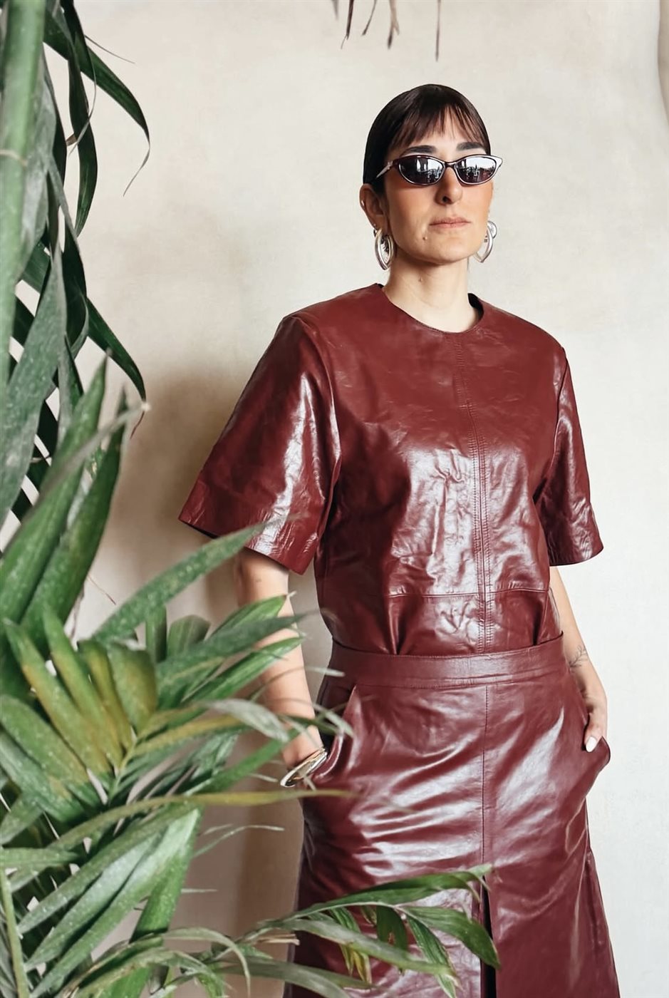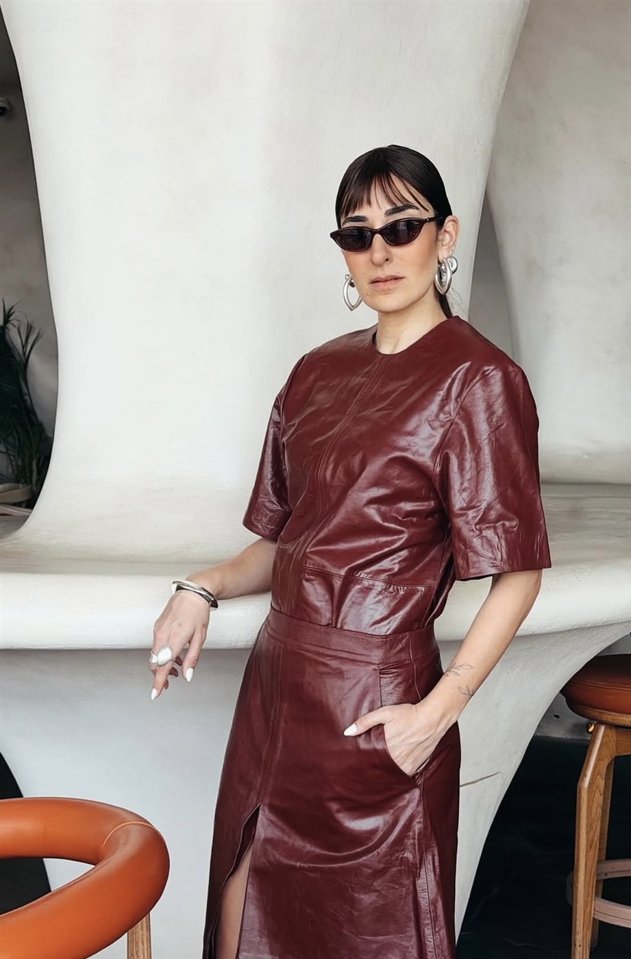 وفي إطلالة أخرى، اختارت فستاناً جلدياً باللون العنابي، جمع بين الجرأة في الخامة والرقي في التصميم، حيث اتسم بقصة مريحة وأنيقة في آن واحد، ليعكس قدرة أمينة على التنقل بسلاسة بين الأساليب المختلفة دون فقدان هويتها الخاصة.