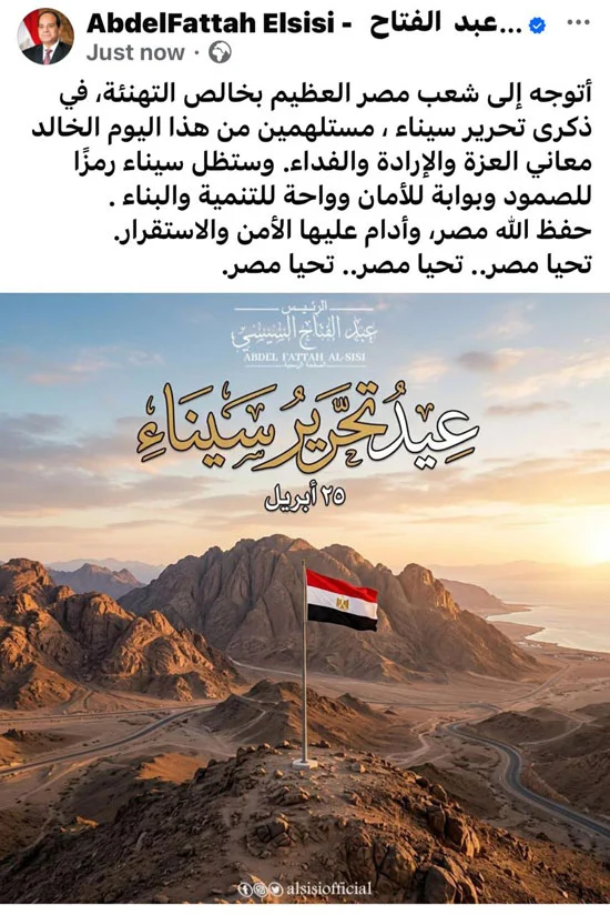 توجه السيد الرئيس عبد الفتاح السيسى، إلى شعب مصر العظيم بخالص التهنئة، في ذكرى تحرير سيناء ، مستلهمين من هذا اليوم الخالد معاني العزة والإرادة والفداء.