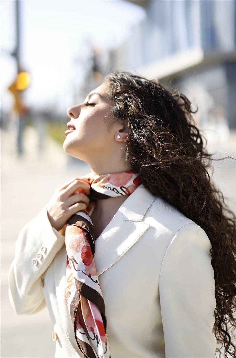 ولإضافة لمسة حيوية، نسّقت إطلالتها مع وشاح حريري متعدد الألوان التفّ حول عنقها، ما كسر حيادية اللون الأبيض ومنح اللوك طابعًا أكثر حيوية. كما اعتمدت نظارة شمسية بتصميم جريء عززت من الطابع العصري، لتظهر بإطلالة أقرب إلى أسلوب “الشوارع الأنيق” الذي يجمع بين العملية والفخامة.
