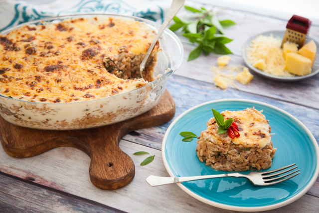 قدّمي الطبق ساخناً وزيّنيه بالمزيد من جبن البارميزان وأوراق الريحان الطازجة.