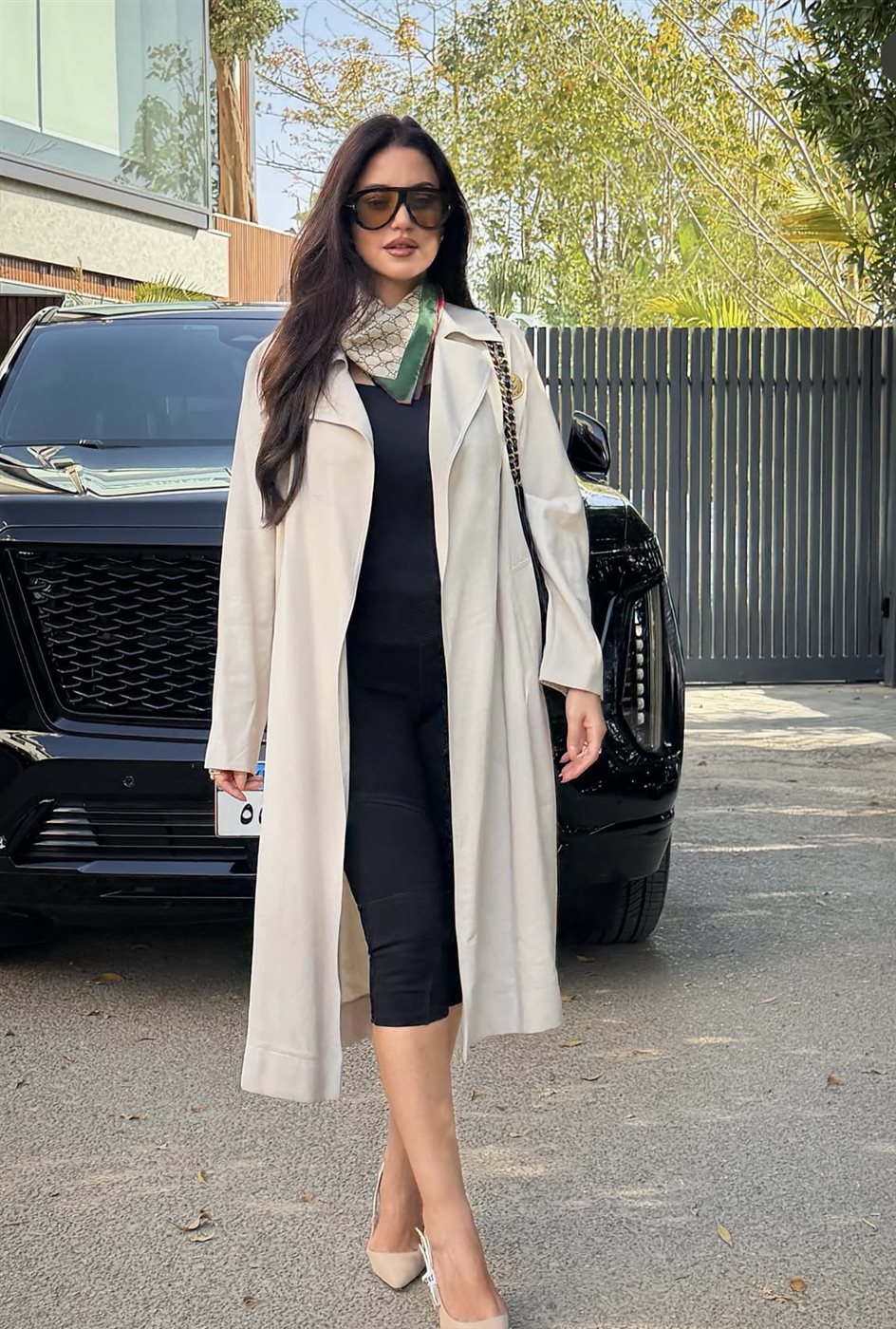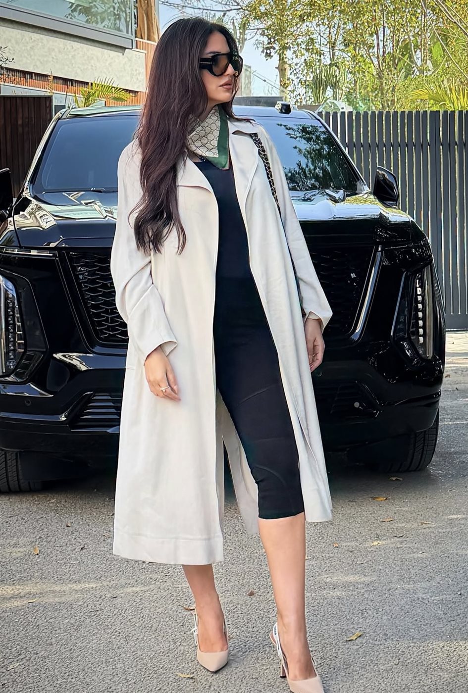 ومن ناحية أخرى، اعتمدت درة زروق في إحدى إطلالاتها أسلوب “Smart Casual”، الذي يوازن بين العملية والرقي. فقد ارتدت فستانًا أسود ضيقًا بطول متوسط، ونسقته مع معطف طويل باللون البيج، في اختيار يعكس توجهات الموضة الحديثة نحو الألوان الهادئة والتصاميم البسيطة. كما أضافت حذاءً بكعب عالٍ بلون nude، ما منح الإطلالة انسيابية لافتة، إلى جانب نظارة شمسية كبيرة أضفت طابعًا عصريًا جريئًا.