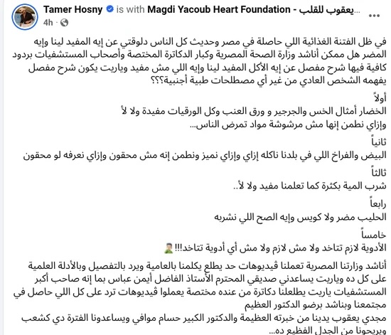 وفي خضم هذه الأزمة، خرج الفنان تامر حسني بمناشدة عاجلة إلى وزارة الصحة المصرية وعدد من الجهات الطبية، مطالبًا بتقديم توضيح علمي شامل للرأي العام بشأن المعلومات المتداولة حول الغذاء والصحة.