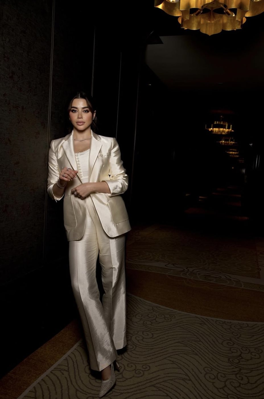وعلاوة على ذلك، تميزت البدلة بقماش لامع خفيف يعكس الإضاءة بشكل أنيق، مع بنطلون واسع يوفر الراحة ويعزز الإحساس بالفخامة، بينما أضاف البليزر المصمم بدقة لمسة رسمية جذابة تناسب مختلف المناسبات.