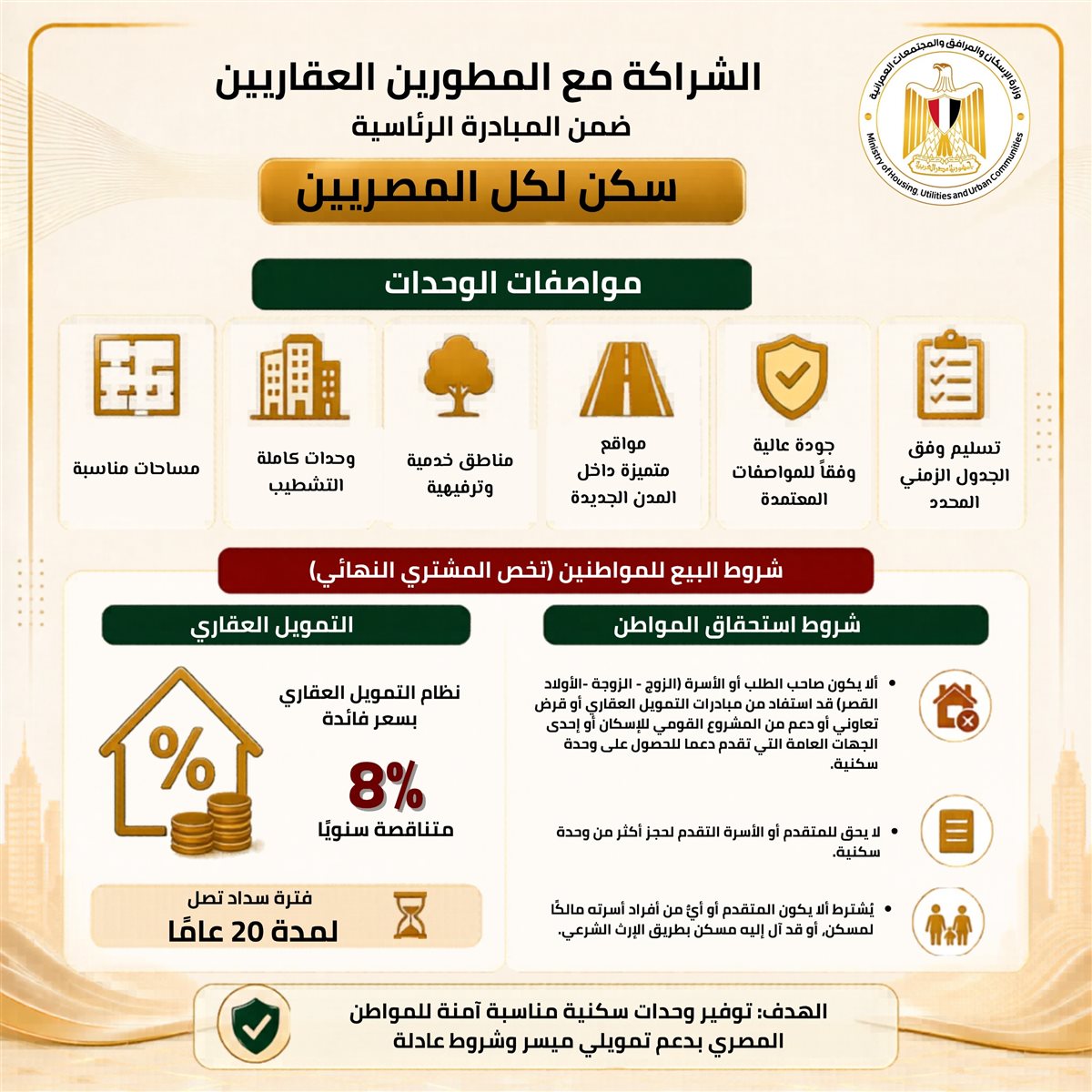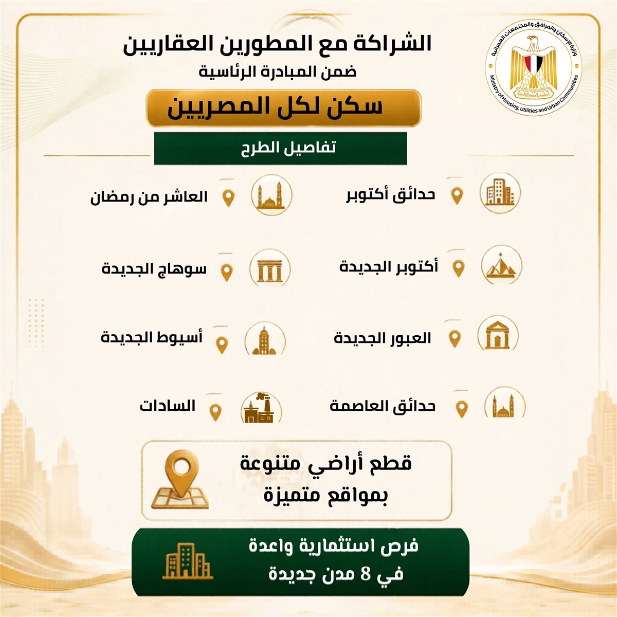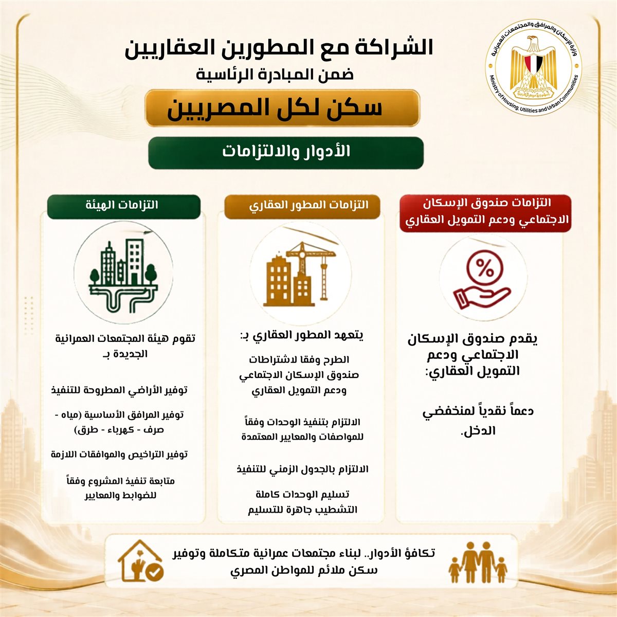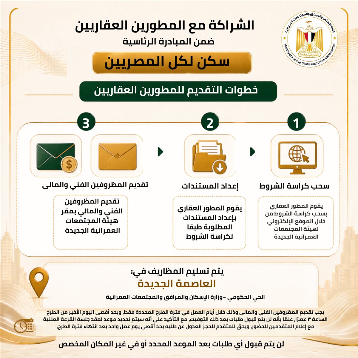 إتاحة كراسة شروط مشروع تنفيذ وحدات سكنية بالشراكة مع المطورين العقاريين من القطاع الخاص، ضمن المبادرة الرئاسية «سكن لكل المصريين»، عبر الموقع الإلكتروني لهيئة المجتمعات العمرانية الجديدة من خلال الرابط: