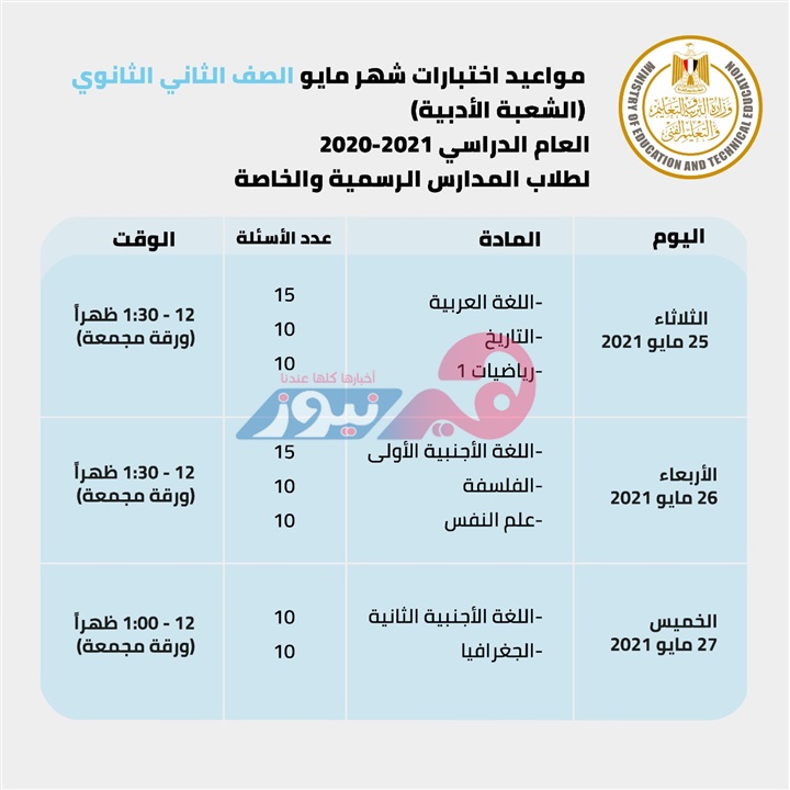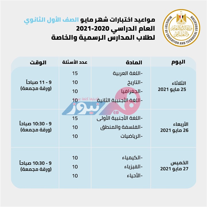 ننشر جدول امتحانات الترم الثاني لأولى وثانية ثانوي