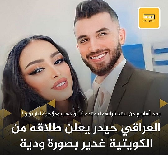 حيث أعلن الشاب العراقي حيدر الفيلي طلاقه من الفنانة الكويتية غدير الفهد، وذلك بصورة ودية وبالتراضي لعدم الانسجام والتوافق.