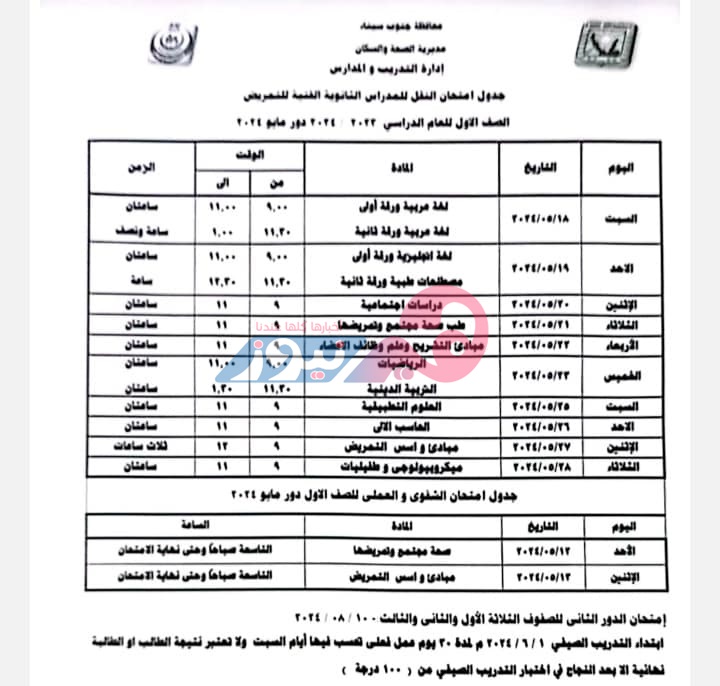 تنطلق السبت المقبل الموافق 18 مايو، أولى امتحانات آخر العام الدراسي 2024/ 2023 التحريرية للصفين الأول والثاني بالمدرسة الثانوية الفنية للتمريض في محافظة جنوب سيناء، وتنتهي يوم الثلاثاء الموافق 28 مايو بالنسبة إلى الصف الأول ، و29 مايو بالنسبة للصف الثاني.
